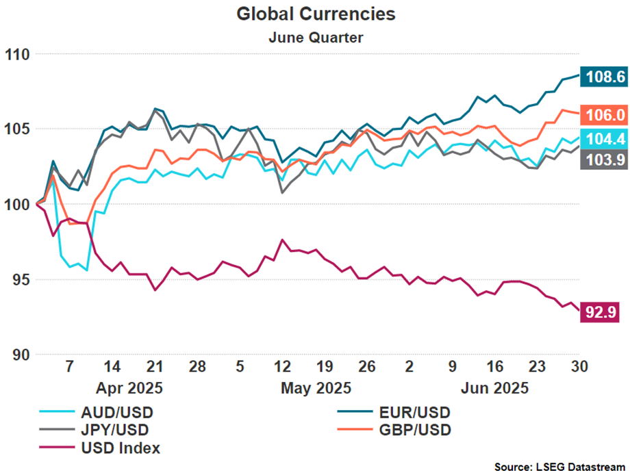 As the dollar weakened, its major peers all gained ground. The Australian dollar, Japanese yen, euro and pound sterling appreciated noticeably, driven predominantly by the dollar’s decline. In addition, stronger economic performance in the eurozone and the Reserve Bank of Australia’s cautious approach to monetary easing provided further tailwinds for both the euro and the AUD.