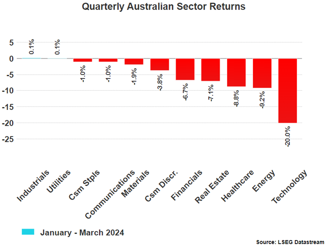 Australian equities fell by 2.85% in Q1. The financial sector, the largest index component, declined by 6.70%. However, the technology sector saw a substantial decline of 20%. The gold sector performed exceptionally, with the All-Ordinaries Gold index climbing over 30%, offsetting some broader market losses.