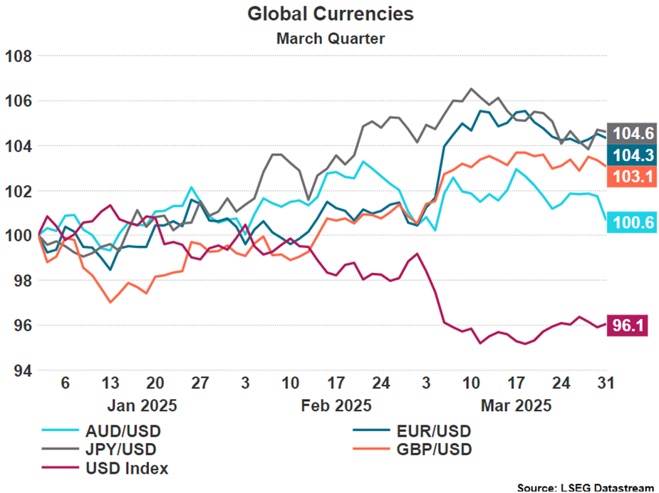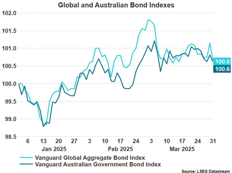 Given market uncertainty, investors favoured defensive assets. The US 10-year Treasury yield declined from 4.57% to 4.22%, increasing bond prices. The Australian bond market similarly benefited from economic uncertainty and a rate cut in February.