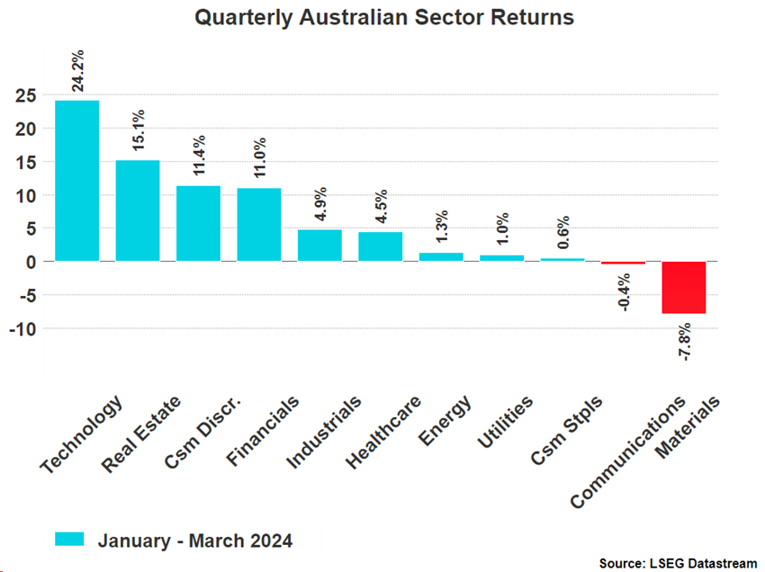 Throughout the first quarter of 2024 the S&P/ASX 200 returned around 4%, this pace being much slower than what we saw near the end of 2023 as strong economic data has pushed expectations for rate cuts back towards the end of the year. The strongest performing sector was Technology, returning 24.2%, as fervour surrounding the A.I. boom picked up speed. Despite this massive rate of return the sector’s performance had little effect on the overall S&P/ASX 200’s performance due to the Technology sector making up just 2.86% of the index. Real Estate also continued to perform well due to the expectation that we are at peak interest rates and approaching the first rate cuts.