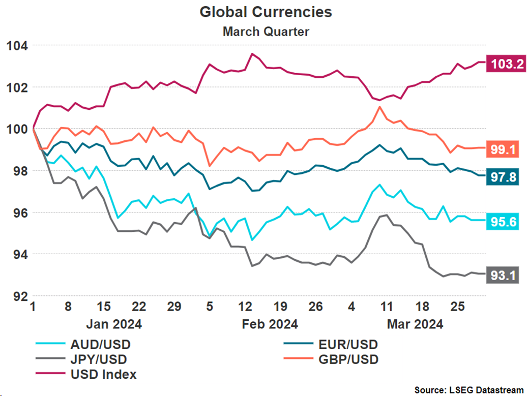 In contrast to the last quarter of 2023 the USD dollar index (DXY) against a basket of currencies strengthened by 3.2% over the first quarter of 2024. This occurring due to strong economic data out of the US and comments from the Federal Reserve leading investors to push back their expectations of rate cuts in the first half of 2024. As rate cuts are expected later, bond yields remain elevated, attracting investors to the USD and increasing its relative value. This has led to a depreciation of the Australian dollar against the USD of 4.4% from 0.68 to 0.65.