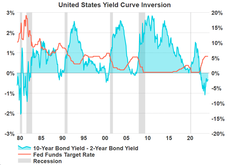 The US continues to have a yield curve inversion, the longest by far in the last 40 years. The inversion which was previously shrinking has slightly expanded again as the expected date of the first Federal Reserve rate cut continues to be delayed. A yield curve inversion is a common recession indicator in the US with every inversion in the past forty years being followed by a recession. With the latest inversion being longer than most that came before investors are waiting to see whether the indicator remains true.