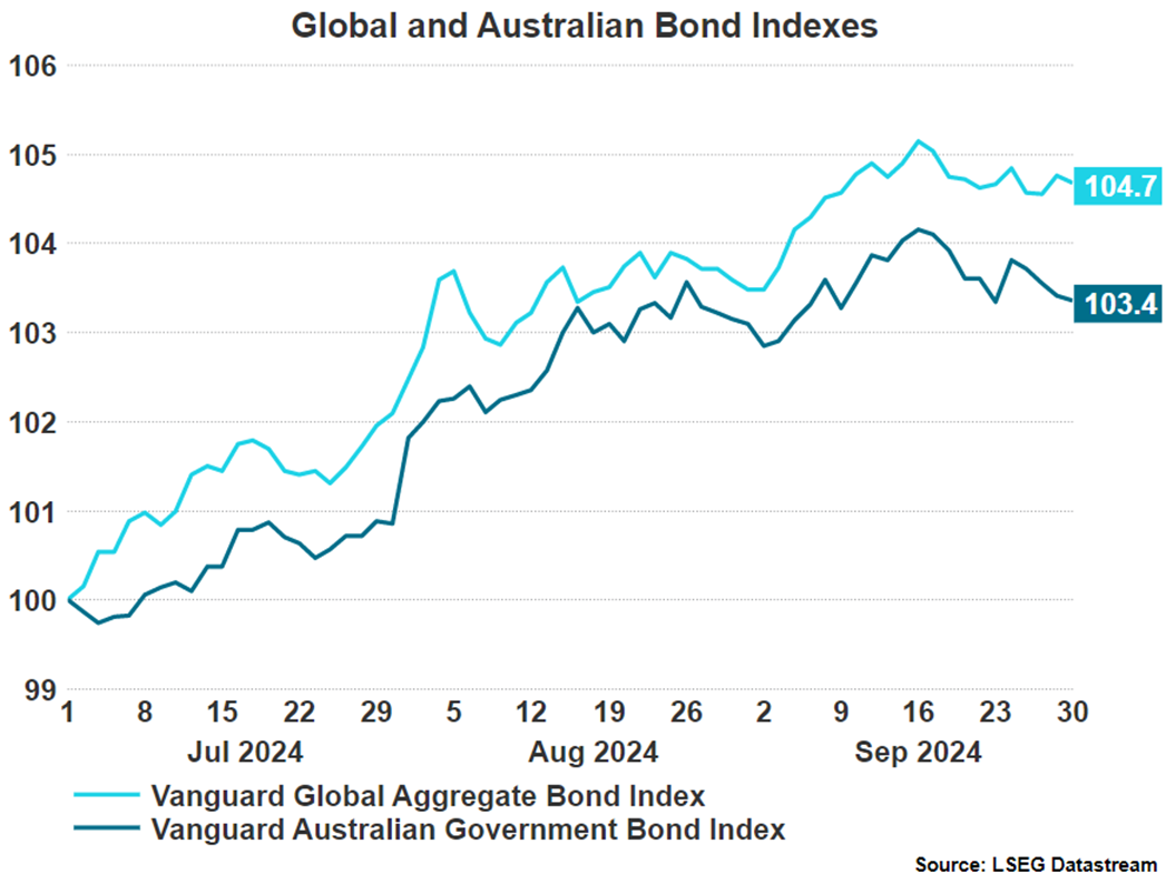 Fixed income markets were a major beneficiary of the September rate cuts which resulted in the US 10-year Treasury yield declining by 49bps. A global trend of falling inflation and subsequently falling interest rates in many developed markets meant that positive fixed income performance was not isolated to the US, and solid returns were seen globally. This is highlighted through the Global Aggregate Bond Index which returned 7% over the quarter. Australia also saw gains in fixed income as investors await signs that the RBA will begin to cut the cash rate.