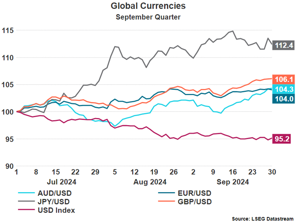 - Bond Prices Rose Off Both Real and Expected Rate Cuts: Over the quarter both global and Australian bonds rose as central banks continued to cut rates globally and Australia comes closer to its first rate cut, which we expect to occur in 2025. Global bond yields fell following the 50bp rate cut in the US which also provided a tailwind to fixed income markets.