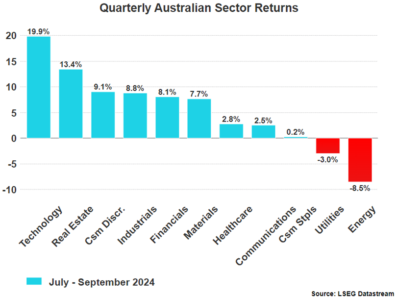 Australian Technology continued to perform well over the third quarter with year-to-date returns now at an impressive 48.53%. Similarly Real Estate also performed well, gaining 13.4% over the period as investors look towards rate cuts and continue to benefit from strong housing demand. On the other hand, Energy struggled amid OPEC revising down its forecasted demand for the remainder of this year and 2025.